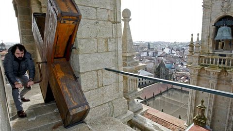 2Desde que en el último año santo, 2010, el Consorcio de Santiago recuperó la carraca de la torre norte, réplica de la que existió hasta mediados del siglo pasado, los trabajadores del Museo Catedral se ocupan de hacerla sonar en Semana Santa. Antonio Sesar, lo hará de nuevo este año, por quinto consecutivo. Este santiagués de 37 años es quien habitualmente da las entradas para ver la colección artística de la basílica, pero viernes y sábado santos se encarga de activar hasta cinco veces la manivela que hace sonar el enorme instrumento de percusión. «Al principio lo llevas bien, pero cuando subes por quinta vez los escalones hasta lo alto de la torre, los últimos 200 ya cuestan», confiesa, y el cansancio se nota hasta para seguir girando la manivela durante cinco minutos, una tradición que se podrá escuchar justo antes 12.00 y 18.00 horas hoy y mañana, con el percutir extra de las 22.00 en la última jornada.