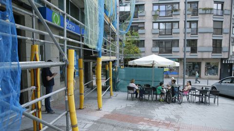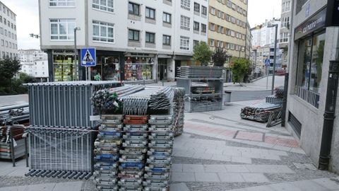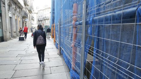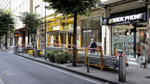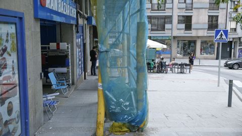 Andamios y contenedores. Las obras modifican el espacio urbano por un tiempo determinado, de modo que grupos de personas como los invidentes se encuentran con lugares que no reconocen y que están llenos de peligros. Es el caso de las fachadas llenas de andamios, como ocurre en la calle Xeneral Pardiñas, o de los contenedores de escombro.
