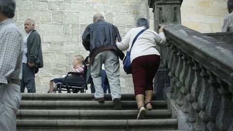 Ausencia de alternativas. Cualquier tipo de escalón es un impedimento para personas que se desempeñan en su día a día en una silla de ruedas, y un obstáculo para muchas otras como ancianos o personas convaleciente. Es por ello que las rampas se han configurado como una buena solución que facilita enormemente la accesibilidad. Pero surgen problemas cuando no se presenta esta alternativa, algo que, aunque se acentúa enormemente en el casco histórico, también ocurre en otras zonas de la ciudad, como es el caso de la plaza de Ultreia. Otro problema surge cuando, aún existiendo rampas como alternativa a las escaleras, estas tienen una combinación de longitud y pendiente que las hace impracticables para sillas de ruedas manuales. Es el caso de la entrada a la facultad de Ciencias de la Comunicación.