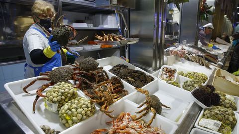 El precio de los mariscos con más demanda todavía se duplicará en los próximos días. En la Praza de Abastos de Santiago el camarón ya llega a los 85 euros el kilo y el centollo y el buey a 28