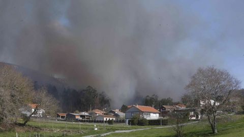 El fuego se inició de madrugada en la parroquia de Figueiras y en su extinción trabajaron cuatro agentes, nueve brigadas, cuatro helicópteros, seis motobombas y una pala