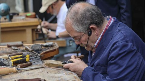 Marqués, aún con restos de azabache en el rostro, indica que ya está en edad de jubilarse, pero que «esta é unha profesión que non se deixa. É un oficio que engancha, de por vida». Es uno de los tallistas más antiguos de la ciudad.