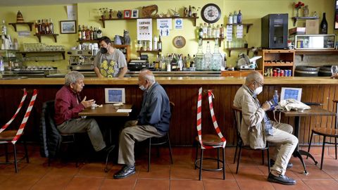 El bar Ourense, de A Raíña, es uno de los locales de Santiago donde tienen claro que el uso de la barra no les compensa económicamente. Jorge Pérez apunta que «para poder usar la barra, tengo que quitar estas mesas que están pegadas a ella. Si hago eso, pierdo seis sitios para ganar cuatro en la barra. No es negocio». A Jorge le sorprende que se exija una distancia de metro y medio entre las espaldas de los que están en las mesas, pero «puedes estar pegado al que tienes en la misma mesa. ¿Es que se contagia ahora por el cogote?», ironiza. La exigencia de los medidores de CO2, mascarillas, gel hidroalcohólico y limpieza del baño «no es un problema. Oí que un hostelero decía que muchos se enterarán ahora de lo que es limpiar un baño, pero no creo que sea así; en general, los baños siempre están bien».