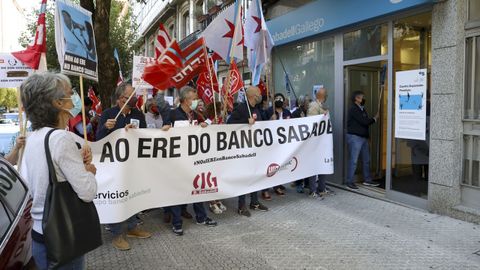 24 sep 2021 . Actualizado a las 05:00 h.Trabajadores del Banco Sabadell-Gallego se concentraron ayer ante las dos sedes más céntricas de la entidad para demandarle que busque medidas alternativas no traumáticas para la plantilla, ante el ERE que está negociando para 1.936 empleados. CC.OO. y UGT convocaron ayer movilizaciones en ocho ciudades, entre ellas, Santiago.