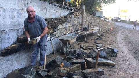 28 oct 2021 . Actualizado a las 22:33 h.Paciencia. Es una de las claves del trabajo de todo buen cantero. «Aquí moitos metros non se dan feito», comenta sobre el ritmo que lleva la obra Gonzalo Núñez, un vecino de Visantoña, en Santiso, que aprendió el oficio cuando era un mozo con Manuel Furelos, un cantero de la parroquia melidense de San Cosme. Eso cuenta mientras trabaja en la aldea de igual nombre que el primer apellido de su maestro. Allí, en Furelos, a los pies del Camino Francés, se puede ver, desde hace un par de semanas, a Gonzalo, levantando el muro de piedra que formará parte del conjunto de la fuente de San Xoán, un surtidor de mina al que a diario acuden a buscar agua para consumo buena parte de los vecinos de ese núcleo jacobeo, conocido por el puente medieval que cruza el río homónimo.