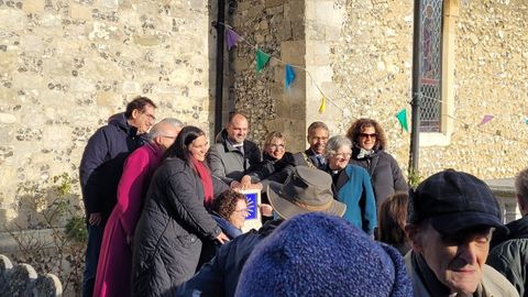Al acto protocolario, que tuvo lugar en un día muy claro y frío donde los más de setenta asistentes celebraban que no hubiera nevado (como sí había ocurrido el día anterior), sucedió una recepción por parte del alcalde y la reverenda de San Bartholomew, donde igualmente repusieron fuerzas antes de emprender la marcha hasta St. Cross, el hospital de peregrinos más antiguo de Gran Bretaña. Allí, los caminantes fueron recibidos como se hizo siempre, sin interrupción, desde tiempos medievales: con un trozo de pan y un cuenco de cerveza.
