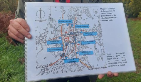 Un mapa del siglo XI, que muestra, y que sitúa fuentes históricas en puntos como Costa Vella, San Roque, Porta do Camiño, Virxe da Cerca, Fonte de Santo Antonio, Fuenterrabía, San Fructuoso o Fonseca, lo prueba. «Eran manancias naturais; a auga crecía de forma natural. Un dato curioso e actual é o de poder seguir bebendo auga de fontes históricas...», reflexiona. «A muralla medieval, que se comezara a levantar —promovida polo obispo Sisnando II— a finais do século X, se completaba cun foxo, saíndo a agua dunha serie de fontes, algunhas aínda en funcionamento», ahonda, retomando el relato del sistema de canalización.