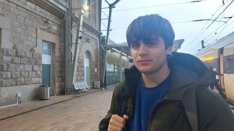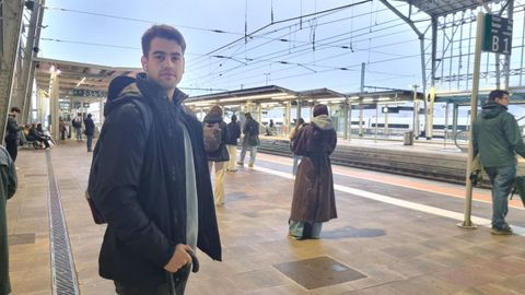 Juan Blas Menéndez, estudiante de la USC, suele desplazarse los domingos a Santiago desde su casa en Vigo, pero esta vez cambio de planes. «Perdí el tren el domingo y, aunque he llegado a la estación con tiempo, el de hoy se retrasó». En principio, el «tren que reservé estaba operativo, no era de servicios mínimos. No decía nada, pero salió con cuarenta minutos de retraso. Es una faena, porque llego muy tarde a clase». A los casi 45 de retraso, tendrá que sumarle el tiempo que le lleva llegar al Campus Norte, «que no está aquí al lado».