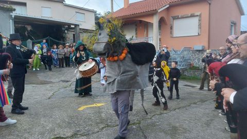 A comitiva estaba formada por choqueiros, veciños vestidos con roupa vella, improvisada e rebuscada na casa, entre os que no faltaron o típico militar, o cura ou a noiva. «A saída do burro fíxose de maneira espontánea, pero a idea é manter a tradición no tempo», conta Tamara Brea, que engade que, antigamente, o animal saía o martes de entroido, a modo de peche das festas máis descaradas. «O burro actuaba como oficiante da comitiva e ía cun vimbio amedrentando aos nenos; se te arrimabas un pouco, podía caerche un vimbiazo», lembra. Os promotores da idea buscan, ademais, involucrar á xente máis nova para que esta tradición sirva tamén para revivir a aldea que, segundo Tamara Brea, está moi decaída despois de pechar as tabernas que había e que eran «espazos socializadores», nun lugar cunha idade media duns 70 anos.
