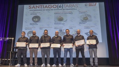18 mar 2026 . Actualizado a las 12:29 h.El concurso gastronómico Santiago(é)Tapas, organizado por Turismo de Santiago con el apoyo de la Diputación y distintos patrocinios, cerró su exitosa edición número diecisiete con el ritual de la entrega de premios a las mejores tapas, seleccionadas entre un total de 73 propuestas culinarias repartidas por 47 establecimientos. Los principales galardones correspondieron a las tapas Castelo da Rocha, de Artesana; Crocante de bacallau á galega, de La Bodeguilla de Santa Marta, y Ópera de Sordo, de La Morena. La primera de ellas recibió el premio a la tapa más creativa, por lo que representará a la restauración compostelana en varios concursos. La tapa de una de las bodeguillas ganó en la modalidad tradicional, mientras que la opción de La Morena fue la premiada en la categoría tapas dulces. Además de la propuesta más creativa, el restaurante Artesana vio como su Castelo da Rocha también se llevaba uno de los premios más especializados, el correspondiente a la mejor tapa con maridaje de vinos.El resto de galardones correspondieron a Suso, con su tapa Románico de transición (maridaje con cerveza); Pico de Galo, por Cáeche a babilla (categoría calidad diferenciada); A Moa, por Dobre cacao (tapa vegana o vegetariana) y A Maceta, por Alfábega e cítricos (tapa sin gluten).Las tapas premiadas fueron elegidas entre las diez mejor valoradas por el jurado, un listado del que también formaban parte El Rincón de Yobeida, con Tropicacheira; Orixe, con Cordeiro de Dior y O Sendeiro, por Macaron de Santiago.