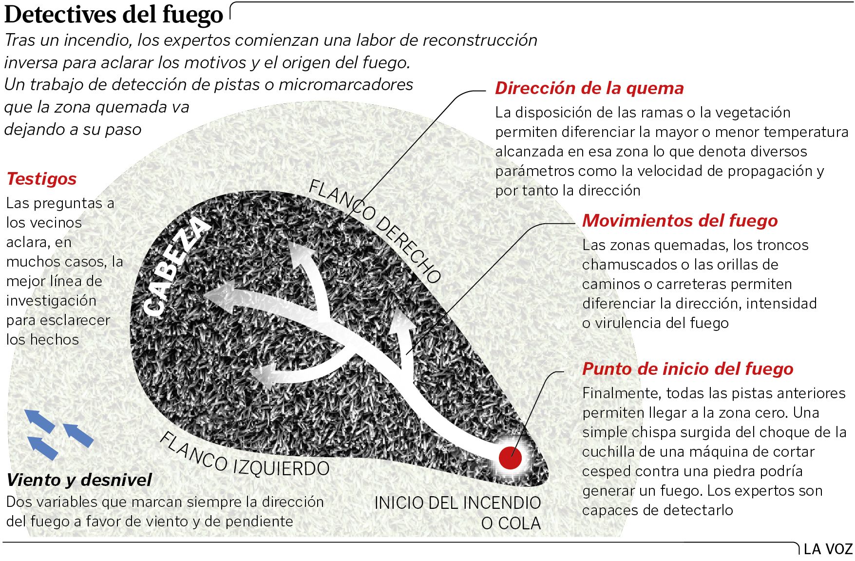 Sea cual sea el incendio hay algunos conceptos comunes que ayudan a destriparlo. El primero son sus partes: la cabeza (donde se apaga), la cola (donde se inicia) y los dos flancos, el derecho y el izquierdo. Y un incendio se investiga siempre de cabeza a cola. Cuando esta se alcanza, los investigadores la delimitan. Es la zona de inicio del fuego que a veces puede ser un metro cuadrado y otras de varias hectáreas. «Nos grandes incendios -explica un policía autonómico- temos zoas de orixe que poden ser un frente de varios kilómetros e hai que investigalos durante varios días».