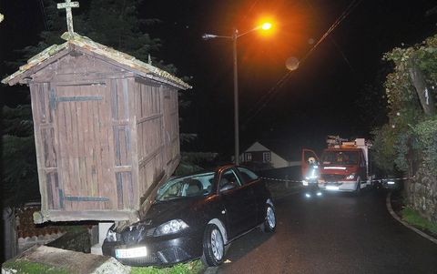 Pese a la situación, el vehículo lleva casi dos días en el lugar, con parte del hórreo en el aire y la vía cortada, por lo que, ayer por la mañana, los propietarios temían el anuncio de temporal ya que «aínda vai caer o hórreo enriba do coche ou da pista», según dijeron.