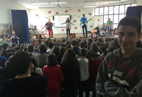 Los dos ejercieron de productores y directores del primer videoclip de A Gramola Gominola, un grupo de música infantil en gallego con una propuesta tan diferente que ha sido nominado en su categoría en la presente edición de los Premios Martín Códax de la Música. El trabajo audiovisual se estrenó ayer en el colegio melidense Mestre Pastor Barral, porque sus ciento setenta alumnos son los coprotagonistas de la narración audiovisual de Campión Internacional, uno de los temas del libro-disco que A Gramola Gominola puso en el mercado el año pasado.