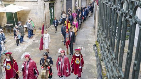 El acto institucional en el Concello finalizó con las dos corporaciones en el balcón del salón de plenos, escuchando las respectivas Bandas de Música, que han interpretado los himnos de España y de Galicia, antes del concierto tradicional en la plaza de Macías de la Banda de Música de Santiago.