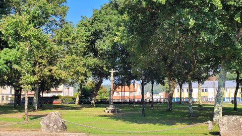 La carballeira está dividida en dos partes por un acceso a la iglesia que se alza al fondo, la de San Fiz de Sales, y a unas viviendas. La parte de la derecha se ve más cuidada, más arreglada, con más detalle y albergando un cruceiro con pousadoiro y parque infantil con buena apariencia (el suelo necesita unos mimos).