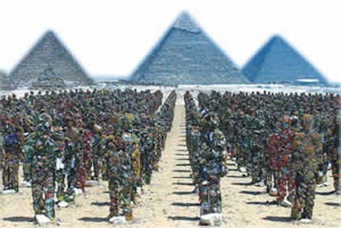 No sé si Ha Schult se habrá inspirado en la televisiva bruja Lola, pero él asegura que vivimos en un planeta de basura y que nosotros mismos somos parte de ella. Pues lo dirá por él, porque yo no me doy por aludida. Pero como estoy muy sensibilizada con la ecología y esas cosas, he dedicido hacerle un hueco a su iniciativa: colocar un ejército de figuras casi humanas creadas a partir de todos los desperdicios que genera el hombre del siglo XXI delante de las imponentes pirámides egipcias. Su intención es llamar la atención sobre los problemas ambientales del mundo. Sólo espero que cuando su exposición acabe, lo deje todo bien recogidito y no quede ni un papel de chicle sobre la arena del desierto. SOPLANDO HARINA. Una diversión más ecológica es la que practican los habitantes de una ciudad cercana a Manila, en Filipinas, a la que corresponde la simpática foto pequeña. La fiesta consiste en llenar un vaso de harina e ir soplando con todas las fuerzas hasta conseguir vaciar el vaso. El que antes lo consiga es el que gana. Supongo que al final de la fiesta quedará toda la ciudad perdida, pero al menos es biodegradable. Post data: Cualquier parecido con el mundo de la droga es mera coincidencia. NACE EL TERCER «ZIDANITO». El jugador del Real Madrid Zinedine Zidane, por cierto uno de los futbolistas más guapos del mundo en mi opinión aún a pesar de esa alopecia galopante, ha sido padre por tercera vez, después de que su esposa, Veronique, diera a luz el sábado a un bebé que se llamará Théo. Con ese padre, seguro que será un bebé monísimo. ANGELINA JOLIE, ADOPCIÓN COMPULSIVA. La que va a por el segundo niño es la actriz Angelina Jolie, que después de rodar su célebre película Tomb Radier en Camboya regresó a casa con Maddox, un niño de esta nacionalidad que había adoptado y al que califica de «pequeño salvaje». Ahora, asegura que está dispuesta a seguir aumentando su familia. Dice que, mientras que algunos maridos tiemblan cuando sus mujeres salen de tiendas, el suyo, Billy Bob-Thornton, lo hace cada vez que ella se va a otro país, especialmente ahora que es embajadora de buena voluntad de Naciones Unidas y visita campos de refugiados. «Para mí tiene todo el sentido ir a un orfanato y encontrar a un niño que necesite un hogar», asegura la actriz. Este fin de semana estuvo en un campamento en la frontera entre Tailandia y Myanmar y no descarta volver a casa con un nuevo hijo. MARINA CASTAÑO, MADRINA DE DOS BURROS. Marina Castaño, viuda de Cela, se convirtió ayer en madrina de dos burros a los que bautizó en el refugio de la Asociación de Defensa del Borrico de Córdoba en el transcurso de un homenaje organizado en memoria del difunto escritor. Los nombres de los animales, hembras las dos e hijas a su vez de las dos burras que la asociación regaló a las infantas Elena y Cristina, son Ruiseñor y Colondrina. Supongo que ahora tendrá que mandarles un huevo de Pascua cada Semana Santa y todas esas cosas que tiene que hacer los padrinos.
