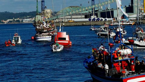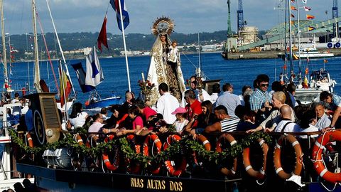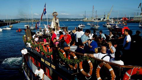 La imagen fue honrada como manda la tradición, con misa de campaña en el puerto y precedida hasta el barco que la iba a llevar por la ría por los mozos -y no tan mozos- bailando la Danza de Arcos. Pero la Virxe no estaba ayer muy marinera.