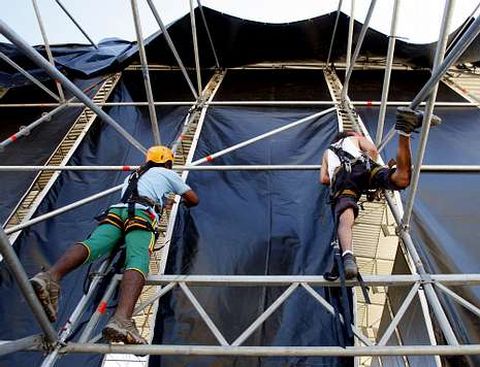Sobre su cabeza vuelan y saludan César y Thomas, dos escafos profesionales que montan el escenario colgados en la estructura principal. «Es un mundo de machos, un trabajo duro y sin horarios, pero más que ser forzudo, lo que importa es que sepan cómo se llama cada cosa», cuenta mientras pasan más camiones. «En veinte llevamos todo lo que se necesita», apunta mientras no para de recibir preguntas de todos los que le rodean.
