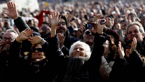 «Viva el papa» y «Benedicto, Benedicto» fueron los gritos de los fieles que, desde varias horas antes del mediodía, esperaban la aparición en la ventana de su apartamento del santo padre, quien presentaba buen aspecto físico, aunque el algunos momentos su tono de voz era bajo.