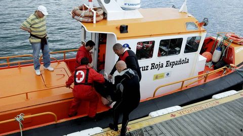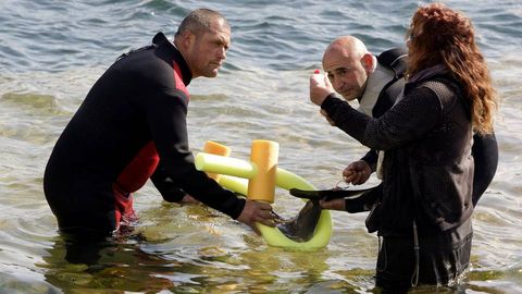 Entonces comenzó un arduo viaje de quince kilómetros en el todoterreno municipal de Valdoviño para acercarlo hasta el muelle cedeirés. «Se le puso crema para protegerlo del sol, y tuvimos que hacer dos paradas para coger agua fresca para ir enfriándolo», relata. Finalmente, tras una hora intentando apaciguarlo en el muelle, y tras hacérsele análisis para su estudio, consiguieron reintroducirlo al mar a dos kilómetros de Punta Chirlateira, en la embarcación Langosteira. Se trata de un macho de 1,56 metros.
