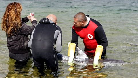 01 jun 2014 . Actualizado a las 13:09 h.Tras siete horas de incansable lucha para devolverlo al océano, un operativo integrado por miembros de la Coordinadora para o Estudio dos Mamíferos Marinos (CEMMA); Protección Civil de Valdoviño; y Cruz Roja del Mar de Cedeira consiguió reintroducir al mar al delfín listado aparecido al mediodía en la orilla de la playa valdoviñesa de A Frouxeira. Fue un vecino de A Coruña que paseaba con su perro quien encontró al cetáceo, que no podía salir de la orilla. «Estaba en una zona de agua pero no podía salir con los bancos de arena», explica Luis. Junto con otro joven que paseaba por la playa y un kitesurfista estuvieron intentando ayudar al animal mientras llegaban miembros de la CEMMA. «Las malas condiciones del mar y viento hacían imposible reintroducirlo en Valdoviño, por lo que se optó por trasladarlo a Cedeira», explica el responsable de la unidad móvil de la zona norte de la coordinadora, Juan Ignacio Díaz.