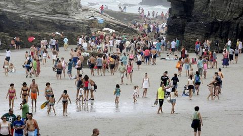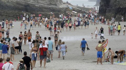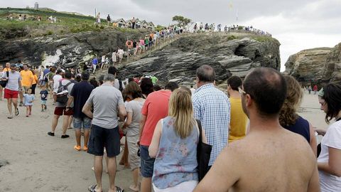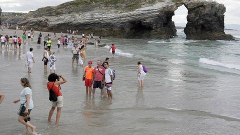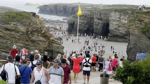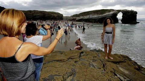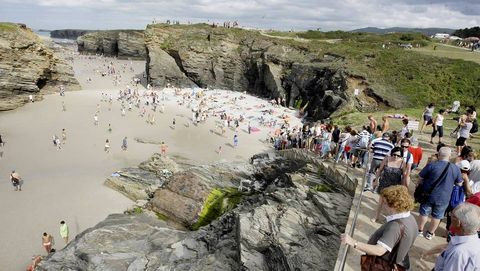 07 ago 2014 . Actualizado a las 13:06 h.Siete y media de la tarde. El mar, avezado amante, culmina su retirada y finaliza el parsimonioso ritual que repite a diario: desnudar la playa de As Catedrais, en Ribadeo. Al fondo se intuyen sus arcos de más de treinta metros -los arbotantes que justifican su nombre-, cuevas, túneles... Bajamar, una soleada tarde de agosto: hora punta en As Catedrais. Centenares de personas se agolpan haciendo cola en el angosto acceso. Al final del día habrán pasado miles. Se escuchan diferentes idiomas.