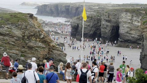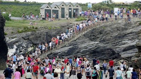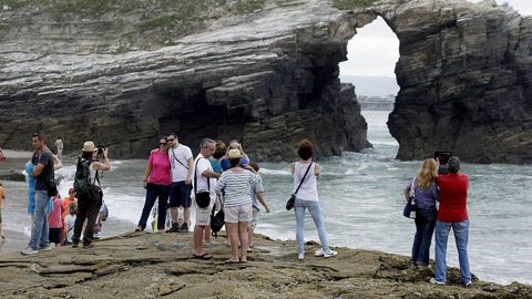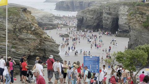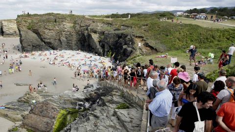 As Catedrais es un icono turístico de Galicia, reconocida en todo el mundo como una maravilla de la naturaleza y con más de medio millón de visitantes al año... pero sin apenas aparcamiento. A medio kilómetro está el prado que alquiló y habilitó el Concello para estacionar. El caos de tráfico es, a menudo, el precio que hay que pagar por ver As Catedrais. Porque en la playa casi todo es gratis. Todo, excepto el uso de los aseos. El Concello, harto de gastar en socorristas, mantenimiento e informadores, implantó este verano una ecotasa de 50 céntimos por usarlos: «Cada día pasa unha media de 650 persoas», dice uno de los encargados, y añade: «Ninguén protesta, só os españois fan algún comentario... temos esa manía».