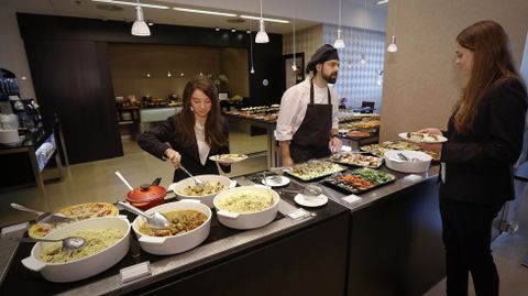 Los platos calientes combinan especialidades de altura, como el rodaballo -que si lo pedimos en cualquier restaurante ya costaría más, por sí solo, que este bufé- y otras de batalla, como macarrones, pizza, judías con jamón o arroz marinero. Cabe destacar las guarniciones (patatas, guisantes, setas salteadas), en absoluto descuidadas; y las grasas, muy controladas, lo que hace que el cliente no salga de la comida con pesadez de estómago.