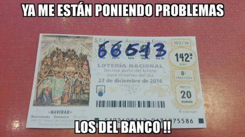 No podía faltar el ministro de Hacienda. Hubo memes variados mostrando a Montoro con un décimo en el que, en lugar del número, aparecía un 20 %, la parte del premio que se embolsa el erario. Ni tampoco se olvidaron, en Levante, de Carlos Fabra, al que es fama que le tocaba todos los años. «Que al Partido Comunista le toque la lotería es un ataque al ideal izquierdista. Que le toque siempre a Carlos Fabra es lógica capitalista», decía en Twitter @aperezherrasti.