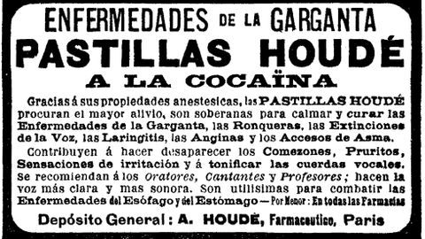 01 abr 2017 . Actualizado a las 11:15 h.Hemeroteca, Miércoles, 11 de febrero de 1885. Hubo un tiempo en el que si a usted le dolía al tragar no tenía que ir al médico a decirle a ni treinta y tres. Bastaba con que se diese un paseo hasta la farmacia del barrio y que le despacharan, sin receta ni nada, una cajita de pastillas de cocaína mentolada. Tampoco hacía falta esperar a que las amígdalas se le pusiesen como botijos, porque las píldoras estaban indicadas para el picor leve. Ya puestos, aunque no le pasase nada a su garganta. El alcaloide se ventilaba como los caramelos de eucalipto. Y prometía, desde la primera toma, dejarle la laringe como la de Caruso, sin pasar por el trago de dos docenas de claras de huevo. Así lo explicaba el anuncio de una de las marcas que fabricaban la panacea: «La tos, ronquera, cosquilleo, resecación y padecimientos de garganta se curan con las pastillas Crespo de Mentol y Cocaína. A la primera pastilla se calma la tos y se nota la mejoría. En todas las farmacias. Pesetas, 1’50».