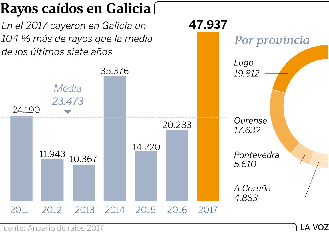 30 ene 2018 . Actualizado a las 05:00 h.El 2017 ha sido un año atípico. Muy cálido, muy seco y con muchos rayos. Tantos, que desde que MeteoGalicia tiene disponible una red de detección de relámpagos (2011), nunca se había registrado tal cantidad de descargas eléctricas en la comunidad. Cerca de 48.000 rayos se produjeron durante el 2017, concretamente 47.937, lo que supone un 136 % más de las descargas del 2016. Además, también resulta atípico el elevado número de días del año en que hubo tormenta, con 78 en todo el 2017, cuando lo normal es que haya de media quince jornadas al año.