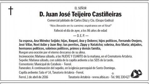 05 nov 2018 . Actualizado a las 12:28 h.El perro de Rainiero de Mónaco, Odin, marchó tras el féretro del monarca el día de su entierro. Y el ferrolano Juan Teijeiro Castiñeiras lo vio atentamente por la televisión. «Yo el día que me muera quiero que pongan el nombre de mi perro en la esquela», dijo entonces. Así fue. El 1 de abril del 2016, al día siguiente de su fallecimiento, la esquela de La Voz reflejó el nombre de las mascotas entre las de los familiares. Después de su esposa, hijas e hijos políticos, aparecen «tus perritos, Zippy y Natacha».