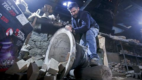 Es un sitio fresco y húmedo donde se respira mucha paz. Chicho confiesa que con 15 años no le apetecía ganarse la vida fundiendo campanas de bronce. Pero la cosa cambió. Con 20 ayudaba a su padre, Enrique López García, hoy jubilado, en el taller. Aprendió el oficio, le gustó y ahí sigue. Mientras da de comer al gato de un vecino fallecido, explica que el proceso de fundición de una campana sigue siendo totalmente artesanal. «Somos o único taller que hai en Galicia e penso que deste tipo tamén en España, pero isto non se valora», dice. Cuando llega un encargo de una campana el proceso se inicia con unas tablas de madera. Se marca el diámetro de la pieza y con unos ladrillos se hace la base de unos moldes huecos por dentro.