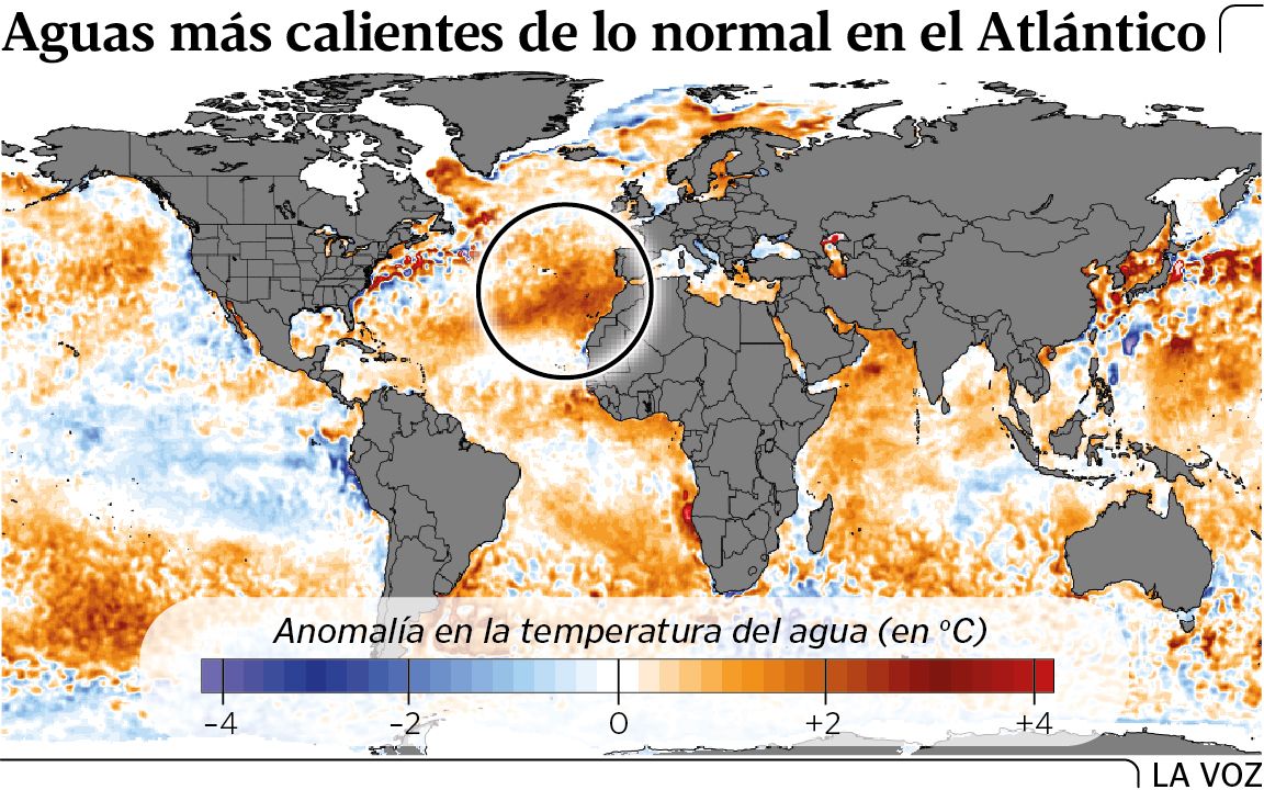 Además, esa región tan amplia de aguas más calientes de lo habitual también afectaría a la dinámica del anticiclón. «Se a anomalía cálida persiste é probable que o anticiclón das Azores se debilite e teñamos máis precipitación do habitual nos próximos meses. É importante matizar que cando falamos do debilitamento do anticiclón, referímonos a un promedio estacional, tamén haberá días nos que estea forte pero en promedio podería estar máis debilitado e por tanto favorecer a que haxa máis días con chuvia», sostiene Insua.
