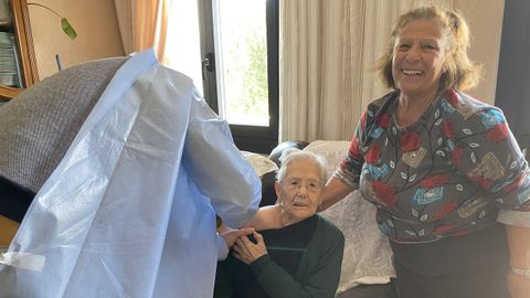 De nuevo en la calle, Christian le contaba a Manuel las paradas que tenían que hacer esa mañana. Calculaban que necesitarían dos horas para atender seis domicilios. El taxista definía la ruta para evitar rodeos y aprovechar el kilometraje. Y el tiempo. Primero a Lentellais para visitar a un enfermo y después, rumbo a Santa Cruz. Sonriente sentada en el sofá del salón esperaba Anuncia Fernández, de 97 años, y todavía más contenta su hija, Luzdivina, de 72. «Ando a tombos e lombos, pero tiña ganas de que me desen a vacina», decía la mayor. «¡E tanto!», apuntaba la hija, que invitaba a café. «Ou ao que queirades». Amablemente al enfermero dijo no. Todavía quedaban paradas en Cambela, Buxán y Chao das donas. Con esa segunda jornada (días atrás puso la primera dosis de Pfizer a otras cuatro personas), Paradelo remataba la vacunación a domicilio. «Aínda pode aparecer máis xente que necesita que vaiamos á casa, pero de momento non avisaron», contaba. En ese caso, tocaría llamar al taxi de nuevo.