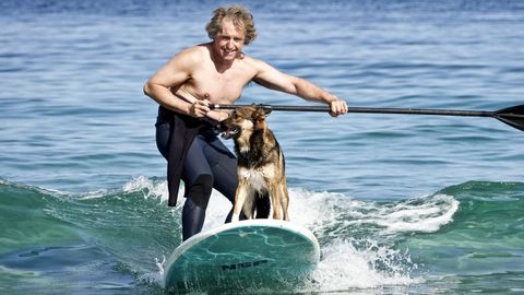 En el concurso hay dos modalidades: en tándem o el perro solo en la tabla. «Cuando va solo tú haces de conductor, porque el perro lógicamente no puede coger la ola solo. Así que el humano tiene que empujarle y después irle a buscar. Es un poco la parte del show y del chiste de verlo encima de la tabla desplazándose. De la otra manera tú eres el piloto y el perro va manteniendo el equilibro». Debe haber, claro, siempre una relación adecuada entre peso y volumen. «Tiene que ser una tabla que flote mucho —bromea— para llevar los cien kilos que pesamos el perro y yo».