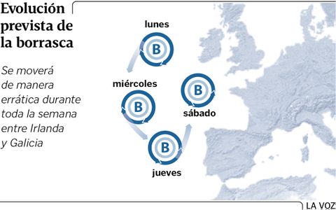 El sistema de bajas presiones quedará atrapado toda la semana entre Irlanda y Galicia y podría dejar registros elevados de precipitación en la mitad oeste