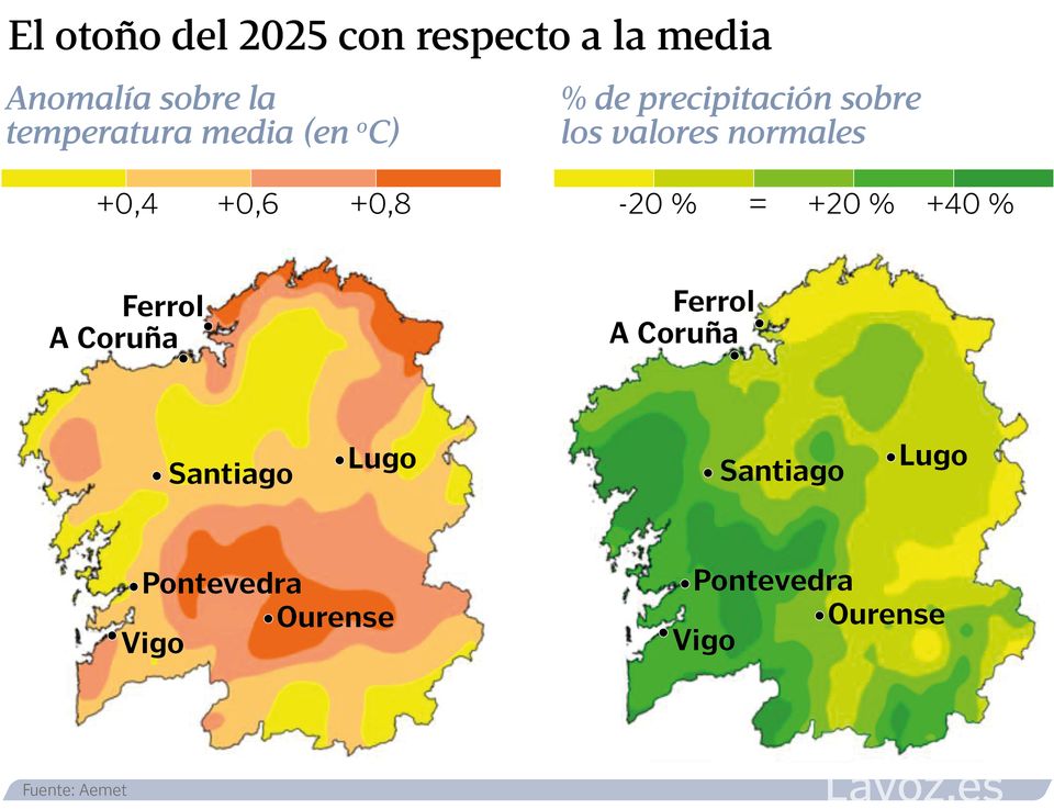 17 dic 2025 . Actualizado a las 14:30 h.La delegación gallega de la Agencia Estatal de Meteorología (Aemet) presentó ayer el balance climatológico del 2025. Aunque faltan unos días para que se consuma, no se espera ninguna anomalía que pueda modificar los datos disponibles desde enero a noviembre. Ha sido un año extremadamente caluroso. «Esperamos que sea el segundo más cálido de la serie histórica que comienza en 1961, solo un poco por detrás del 2023. Terminará superando 1,3 grados el período 1991/2020», confirma Francisco Infante, delegado de la Aemet en Galicia.