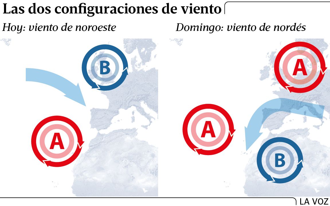 El domingo, la borrasca se va a desplazar hacia el sur hasta situarse entre el norte de África y el Mediterráneo. Desde esta ubicación va a impulsar una circulación de nordés, que en Galicia asociamos con las altas presiones, no con las bajas. Una vez más se demuestra que la influencia en meteorología depende mucho de su posición.
