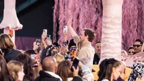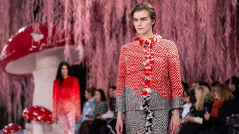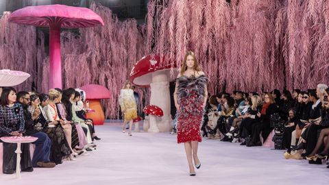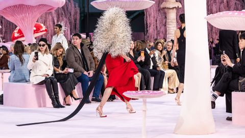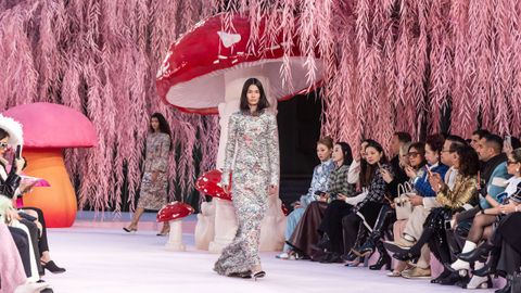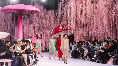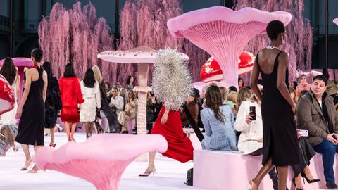 Para la ocasión, el interior estaba decorado con setas de colores de diferentes tamaños y grandes árboles rosas que reproducían el sauce llorón. La pasarela, de un delicado rosa igualmente.