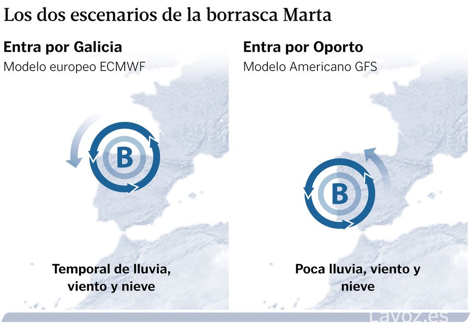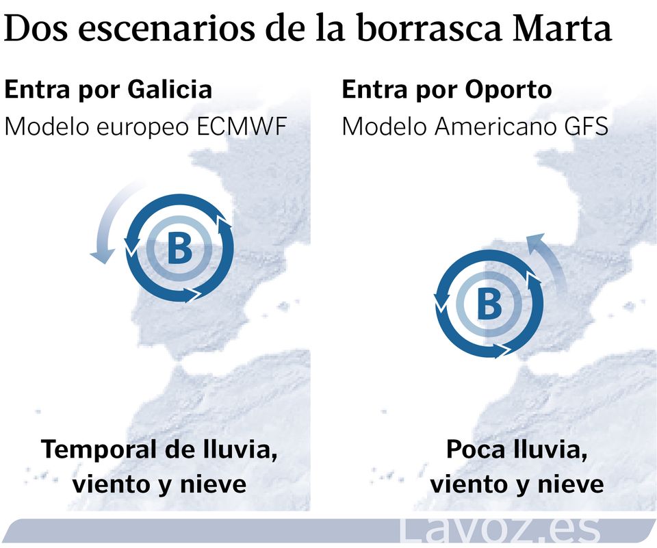 El caso de Marta es lo último que faltaba en este escenario de temporales sucesivos. Se trata de un pequeño sistema de bajas presiones que también sigue una trayectoria más meridional de lo normal. No es explosiva, pero su presión central caerá de manera bastante brusca en apenas unas horas. Además, como suele ocurrir con este tipo de sistemas, existe mucha incertidumbre sobre su evolución. En estos momentos, los principales modelos, el europeo ECMWF y el americano GFS, muestran dos escenarios completamente diferentes. Y esto es muy importante porque en uno de ellos podría producirse un temporal de lluvia y nieve en Galicia.