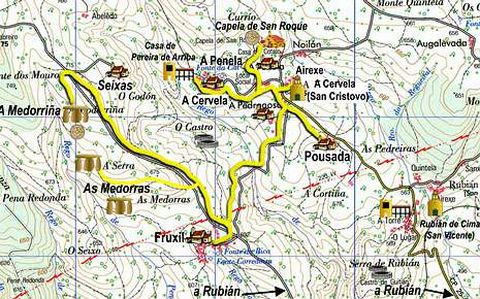 La visita puede empezar en el lugar de A Pedragosa, a 3,4 kilómetros del desvío que lleva hacia A Cervela desde la carretera C-546. Allí parte a la izquierda de la carretera un vial que lleva al núcleo de Fruxil, distante 1,4 kilómetros. Cien metros antes de llegar al pueblo aparece un cruce de carreteras donde hay que torcer a la derecha en dirección a Seixas. Medio kilómetro más adelante, a la izquierda del vial surge una pista de tierra que lleva al lugar de As Medorras de Fruxil, nombre que se debe a un conjunto de mámoas o dólmenes. Hoy solo es visible una de ellas, aunque también está cubierta por la vegetación.