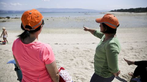 El día despuntó lloviendo en Arousa pero a la una de la tarde el sol le pudo a las nubes y hubo jornada de playa. A golpe de lunes y a final de mes no era de esperar una avalancha, de modo que la vigilancia se presumía tranquila. Así fue. Con tan poca gente, las sequeiras hasta se pueden relajar y sentarse a conversar mientras otean el horizonte. Con todo, ayer no faltó una incidencia, precisamente en la playa de Xestelas, porque un hombre se negó a soltar unas almejas cuando fue requerido para ello y, cuando esto ocurre, las mujeres llaman a los vigilantes de la cofradía que hacen el servicio desde tierra. La multa por coger marisco oscila entre 150 y 1.000 euros, y ya van unas cuantas.