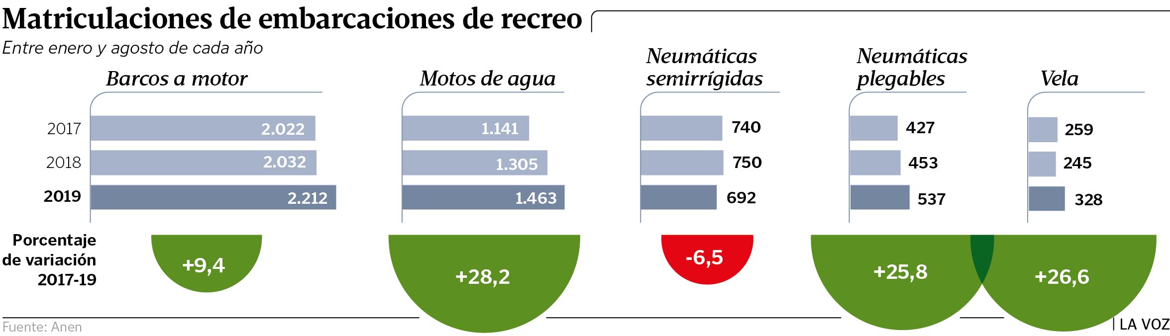 Las embarcaciones neumáticas plegables empiezan a despuntar en el mercado náutico El sector está en un momento dulce. El mercado sigue creciendo y, hasta agosto, se registró un incremento de un 9,3 % en las matriculaciones. Se han dado de alta 5.232 unidades más, frente a las 4.785 que se incorporaron al censo en el mismo período del 2018. De esos barcos matriculados, 328 fueron veleros, tipo por el que el año pasado habían optado 245 aficionados a la náutica.
