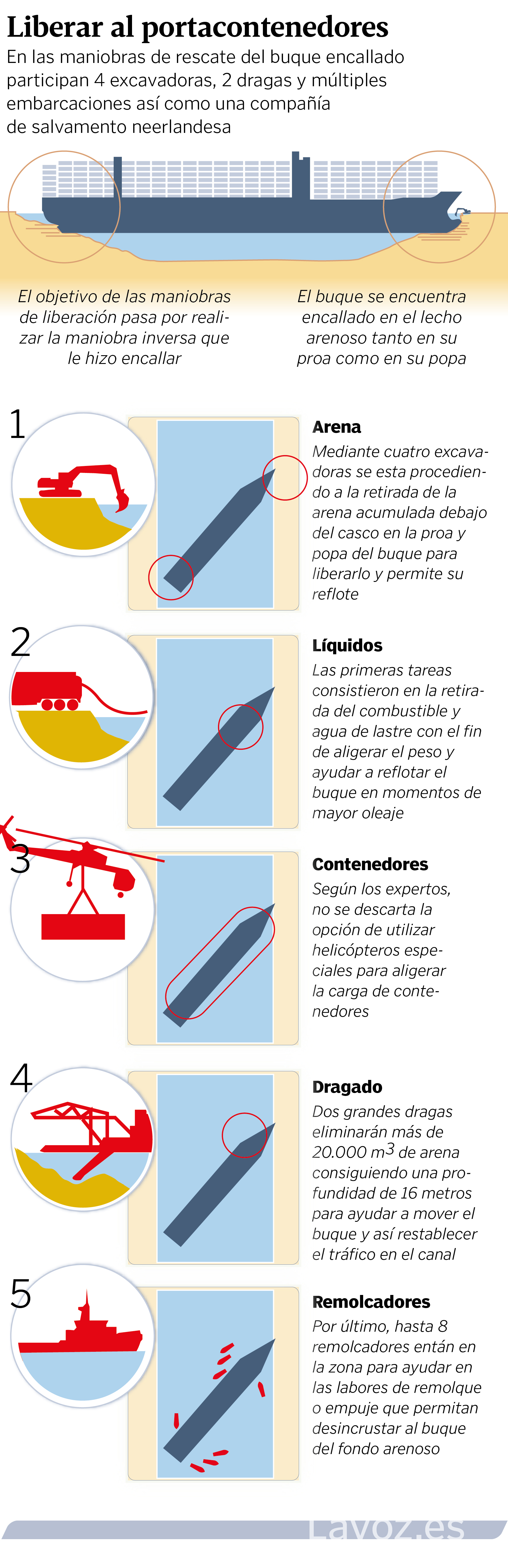 A su cabeza ha acudido estos días el caso del Blue Star, el barco que encalló en Ares y que permaneció casi 20 días encallado en la costa porque no había remolcadores con suficiente potencia para mover y retirar de las rocas el quimiquero. Algo que parece mentira, dado el tránsito de buques de estas características frente al litoral gallego. Pero así es. Aquí, como en Suez, ha habido que recurrir a Smit, especializada ya en atender problemas candentes como el de un petrolero chatarra que amenaza con vomitar 77.000 toneladas de fuel o el de retirar un megaportacontenedores que ha provocado el atasco marítimo del siglo. Ahora bien, «más que echarle la culpa a que la infraestructura tiene muchos años, lo que habría que criticar es que no hubiese un plan de emergencia preparado y ágil para reaccionar, porque ahora lo que podría ser problema de uno o dos días puede tardar siete en resolverse.