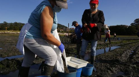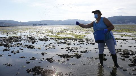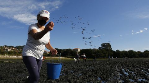 En esta jornada, las mujeres distribuyeron la semilla de almeja en los surcos en la arena abiertos por un tractor adaptado específicamente para este tipo de trabajos en la playa, En ese segundo operativo se sembraron en dos bancos de este litoral dos millones de unidades de almeja japónica, con dos tamaños de media, entre 7 y 9 y entre 10 y 11 milímetros. El portavoz de Pedra da Oliveira, José González, explicó que se trata de producto que adquieren a un suministrador de Francia y que se ajusta bien a las condiciones de la ría viguesa. Está previsto, si todo discurre sin problemas, que la almeja sembrada este mes esté lista para su comercialización en un año y medio.