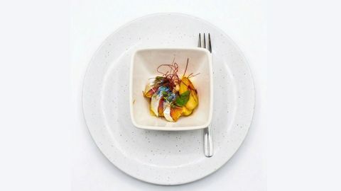 - Xarda marinada. Sobre vieira del pacífico, acompañada de manzana ácida.