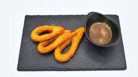 - Churros con chocolate dorado. Patata, jugo de carne y oro en la propuesta del Bruma.