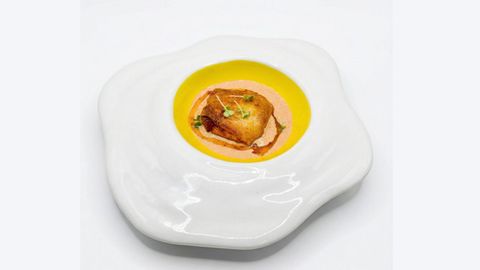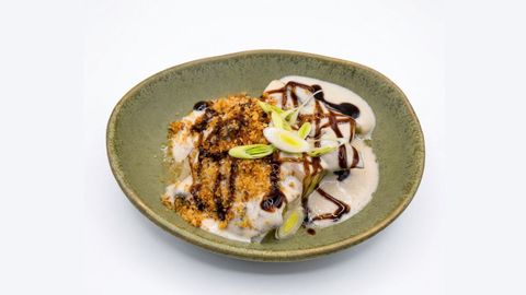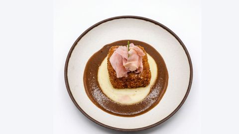 - Crocante de panceta. Sobre cremoso de patata con jengibre desde O Crisol.