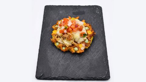 - Gofre campero. De patata y queso, gallo de corral y vegetales.